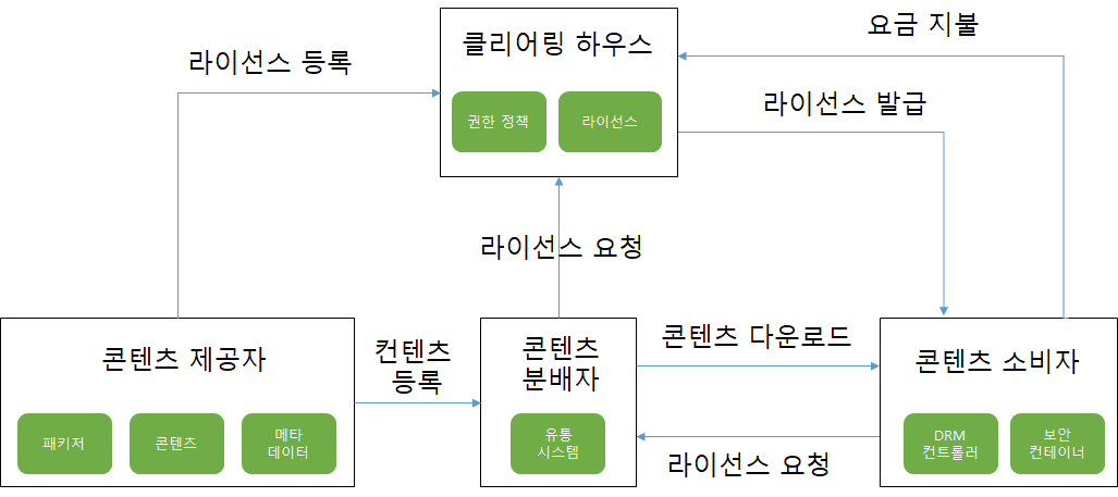 디지털 저작권 관리의 흐름 * 클리어링 하우스 : 저작권에 대한 사용 권한, 라이선스 발급, 사용량에 따른 결제 관리등을 수행하는 곳