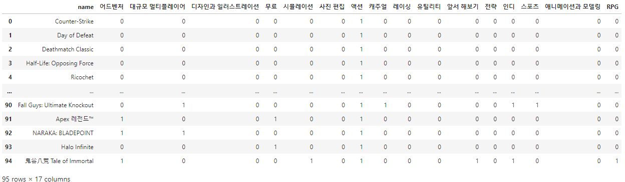 시작하기에 앞서서 게임별로 각 장르의 원핫 인코딩을 진행했다. 결과는 아래와 같다.