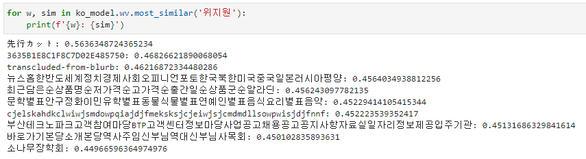 from gensim import models ko_model = models.fasttext.load_facebook_model('get_data/cc.ko.300.bin.gz') for w, sim in ko_model.wv.most_similar('블라블라'): print(f'{w}: {sim}')ㅋㅋㅋ 너무그런가.. 무명인과 유명인의 차이..? 하하^^;; 그래도 학습이 잘되어있다는 것을 알 수 있다 ㅎㅎ..