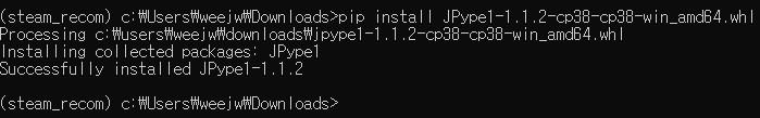 아래와 같은 에러는 JPYPE를 다운로드 받고 pip로 설치하면 된다(파이썬 버전이랑 주의깊게 보도록.. 파이썬 버전 안맞는거 받아서 한참 뭐지? 했다)