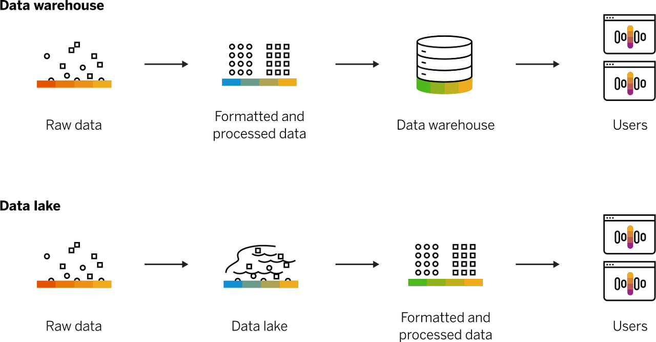- 재미난 사실은 Data Warehouse는 비즈니스 분석가가 주로 사용하고, Lake는 데이터 사이언티스트가 주로 사용한다. 그래서 Lake는 일반적으로 데이터 분석/기계 학습에 사용된다.