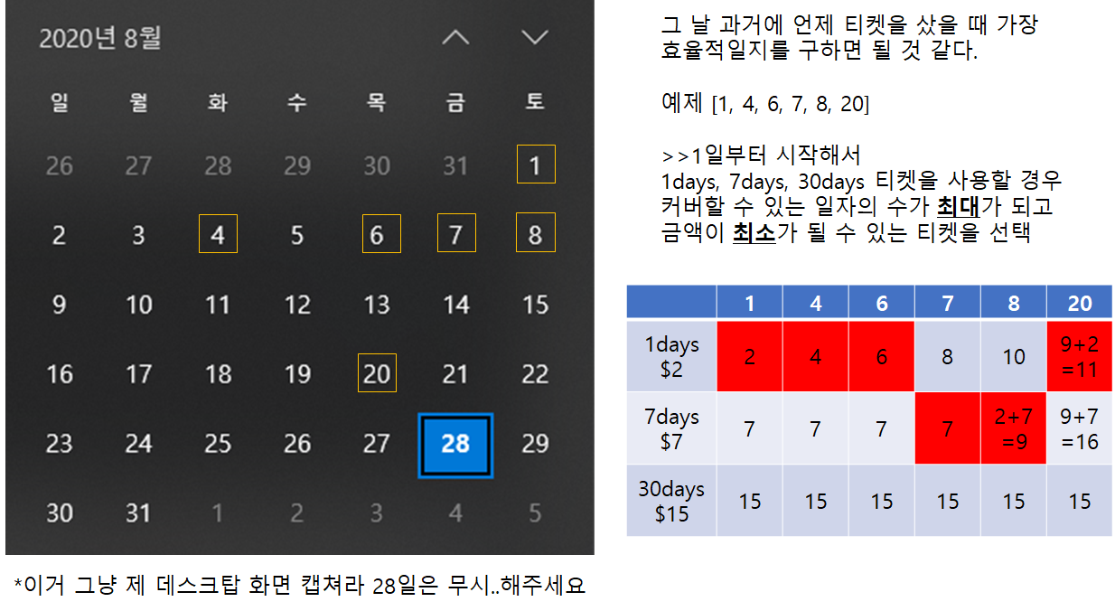 class Solution: def mincostTickets(self, days, costs) : ticketCosts = [0 for i in range(max(days)+1)] def existIdx(paramDay): #-idx 에러 방지용 try: return ticketCosts[paramDay] except IndexError: return 0 # 오늘 사고 + 3 case # 1. 1일전에 티켓을 샀다.+ # 2. 7일전에 티켓을 샀다. # 3. 30일전에 티켓을 샀다. for day in range(1, len(ticketCosts)): if day not in days: ticketCosts[day] = ticketCosts[day-1] continue print("현재 날짜:",day, "\n1일전에 살경우:",existIdx(day-1)+costs[0], "\n7일전에 살경우:",existIdx(day-7)+costs[1], "\n30일전에 살경우:",existIdx(day-30)+costs[2]) ticketCosts[day] = min(existIdx(day-1)+costs[0], existIdx(day-7)+costs[1], existIdx(day-30)+costs[2]) return ticketCosts[-1]https://weejw.tistory.com/391?category=892552
