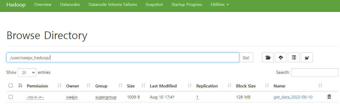 items = res.json().get('response').get('body').get('items') from hdfs import InsecureClient client_hdfs = InsecureClient('http://192.168.1.33:9870', user='weejw') now = datetime.datetime.now().strftime('%Y-%m-%d') path = f'/user/weejw_hadoop/get_data_{now}' client_hdfs.write(path, json.dumps(items), overwrite=True, encoding="UTF-8")