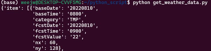 나는 요즘 날씨가 엉망이라서 날씨 데이터 API를 사용하려한다. 기상청_단기예보 ((구)_동네예보) 조회서비스 API를 사용하였다. API를 통해 데이터를 받아오는 Python 코드는OpenAPI 활용 - 날씨 정보를 사용한 맛집 추천 프로젝트를 참고하였다.