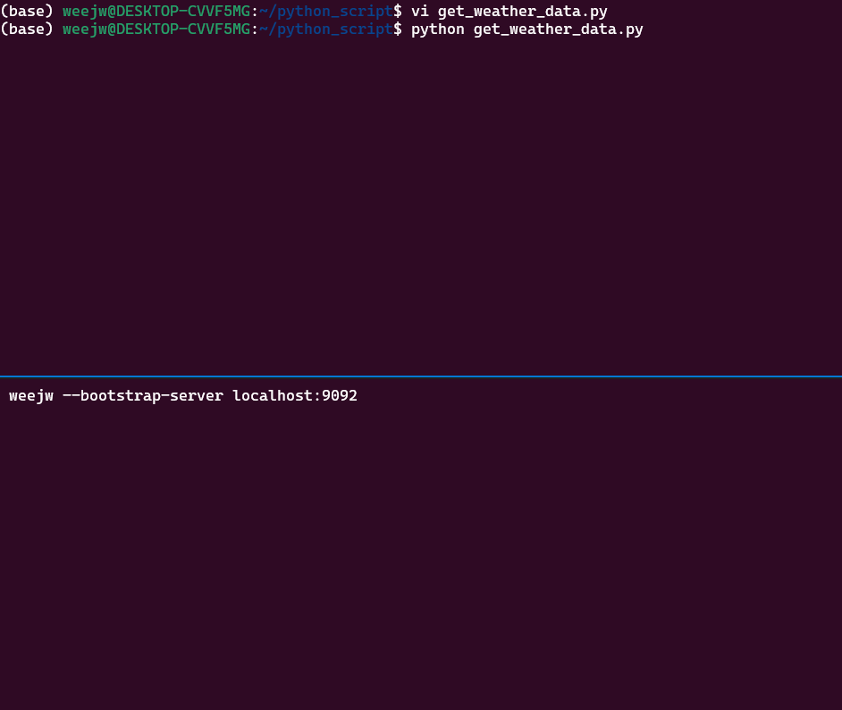 굳이? 왜이렇게 하느냐라고 생각이 들겠지마는,, 그냥 공부하는거니까 다 써보려고 하는 것이다 코쓱.. 😏 찾다보니까 python에서 바로 publish도 된다. kafka-python 라이브러리를 이용해 아래처럼 코드 간단하게 짜보고 진행해본결과 문제없이 잘된다. 그래도 공부를 하기위해 HDFS에 저장해서 꺼내서! publish를 해보자 크크