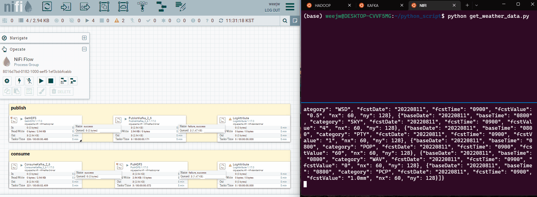 위에서 배운 것들을 활용해서 모두 합치려고하다가 How to integrate Apache Nifi with Kafka 이라는 글을 보고 나도 API를 활용해 해당 데이터를 nifi를 이용해서 kafka로 데이터를 수집 및 처리하고 hdfs에 저장해야겠다 라는 생각을 했다. 전체 흐름도는 8. NiFi Kafka to HDFS.md 도 참고하였다.