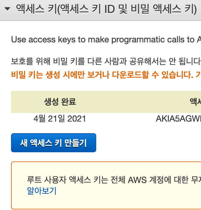 class S3PipeLine: def __init__(self): self.REGION = "ap-northeast-2" self.AWSAccessKeyId = ">_<" self.AWSSecretKey = "secret" self.BUCKET_NAME = "tistorybucket" def process_item(self, item, spider): s3 = boto3.client( 's3', region_name=self.REGION, aws_access_key_id=self.AWSAccessKeyId, aws_secret_access_key=self.AWSSecretKey ) s3 = boto3.resource('s3') for bucket in s3.buckets.all(): print(bucket) s3.Bucket(self.BUCKET_NAME).put_object(Key='TistroyCrawlerData.json', Body=pickle.dumps(item), ACL='public-read') return item엑세스키랑 시크릿키는 아래 보안자격증명에서 만들 수 있다.